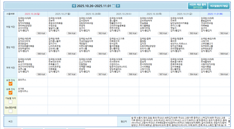 주간식단표 2025.10.19~10.25,10.26~11.01 페이지 정보 작성자 운영자 쪽지보내기 메일보내기 자기소개 아이디로 검색 전체게시물 쪽지보내기 메일보내기 자기소개 아이디로 검색 전체게시물 작성일25-10-21 16:24 조회106회 댓글0건 본문 주간식단표 2025.10.19~10.25,10.26~11.01 다음글 목록