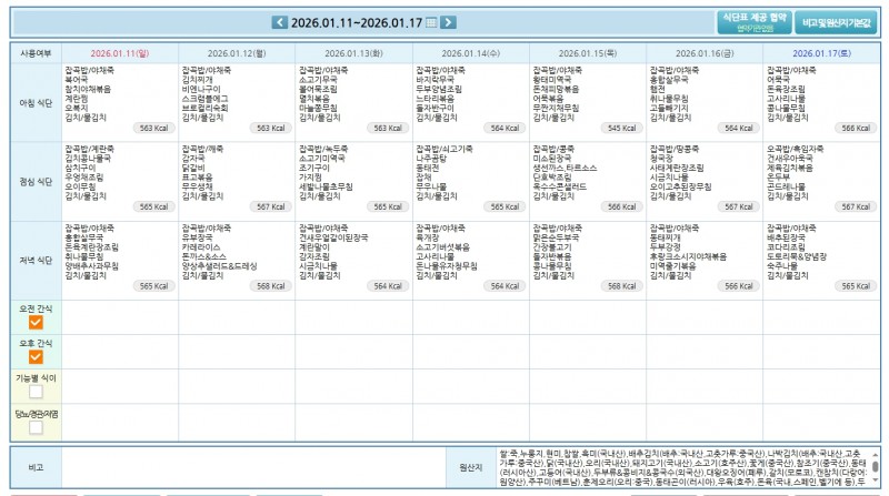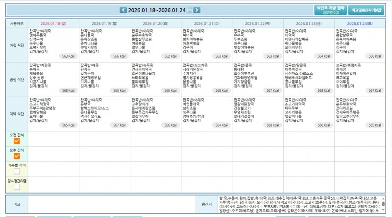 주간식단표 2026.01.11~01.17, 01.18~01.24 페이지 정보 작성자 운영자 쪽지보내기 메일보내기 자기소개 아이디로 검색 전체게시물 쪽지보내기 메일보내기 자기소개 아이디로 검색 전체게시물 작성일26-01-07 10:53 조회102회 댓글0건 본문 주간식단표 2026.01.11~01.17, 01.18~01.24 다음글 목록