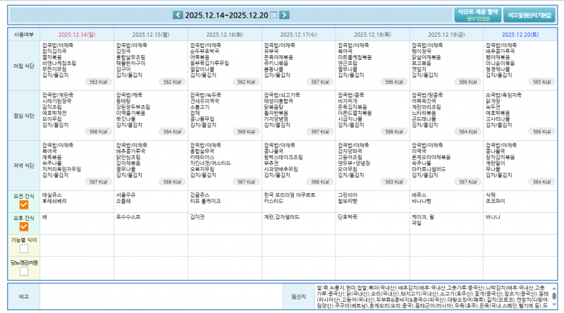 주간식단표 2025.12.14~12.20, 페이지 정보 작성자 운영자 쪽지보내기 메일보내기 자기소개 아이디로 검색 전체게시물 쪽지보내기 메일보내기 자기소개 아이디로 검색 전체게시물 작성일25-12-11 10:31 조회55회 댓글0건 본문 주간식단표 2025.12.14~12.20, 다음글 목록