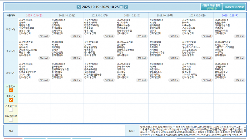 주간식단표 2025.10.19~10.25, 페이지 정보 작성자 운영자 쪽지보내기 메일보내기 자기소개 아이디로 검색 전체게시물 쪽지보내기 메일보내기 자기소개 아이디로 검색 전체게시물 작성일25-10-21 16:24 조회34회 댓글0건 본문 주간식단표 2025.10.19~10.25, 다음글 목록